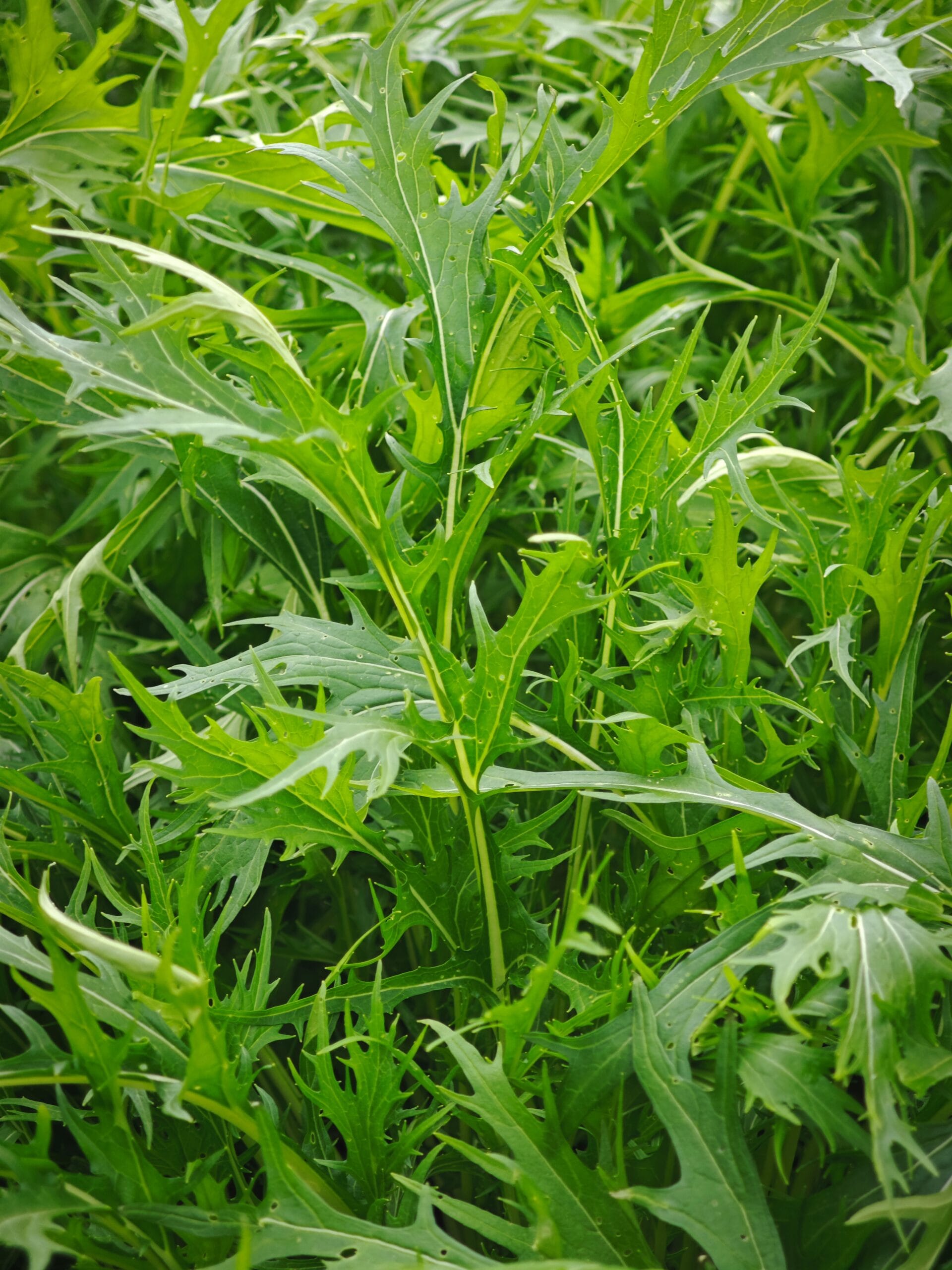 - Mizuna (Brassica rapa var. nipposinica): perasti listovi, blagi pikantan okus, brzo raste.