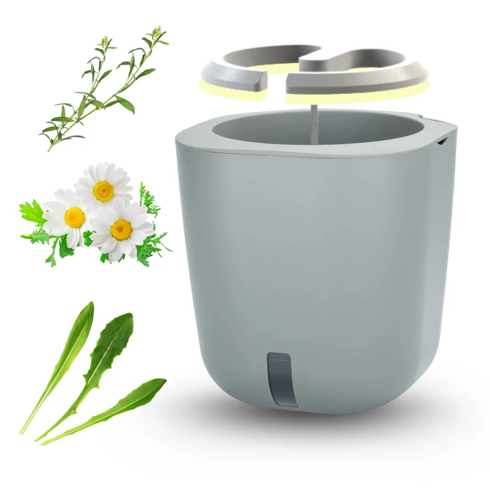 Samozalijevajuća tegla s LED lampom i biljkama odabranima za lagodnu probavu. Idealno za svakodnevne čajeve i svježe dodatke jelima.
